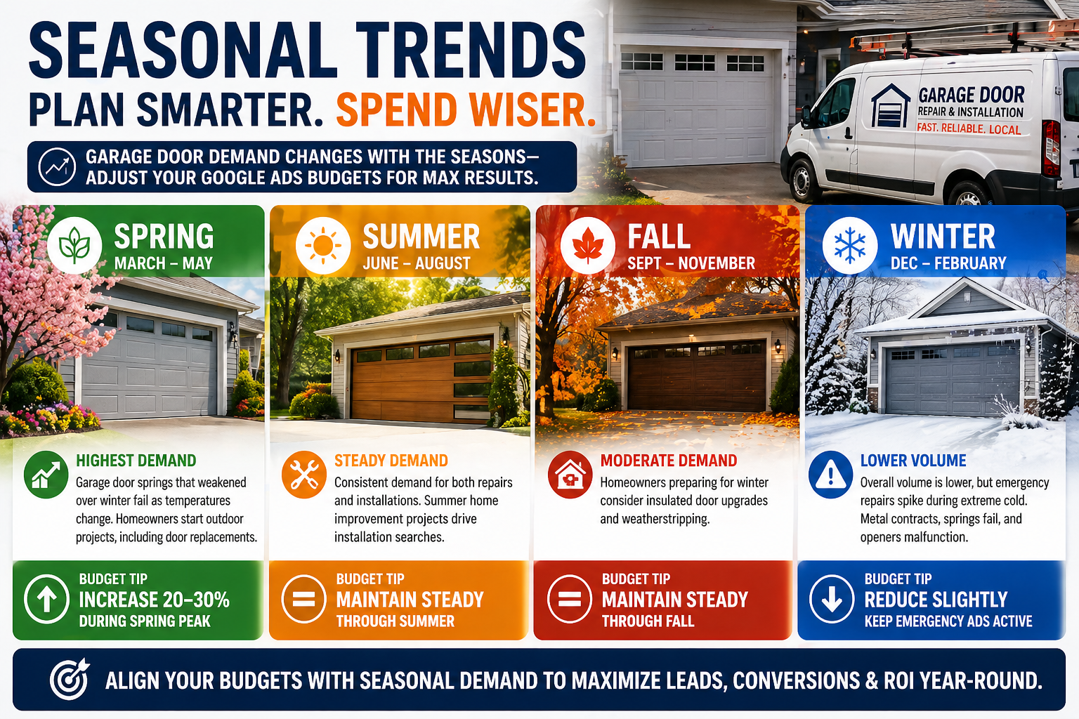 Adjust your budgets accordingly: increase 20-30% during spring peak, maintain steady through summer and fall, and reduce slightly in winter while keeping emergency campaigns active.