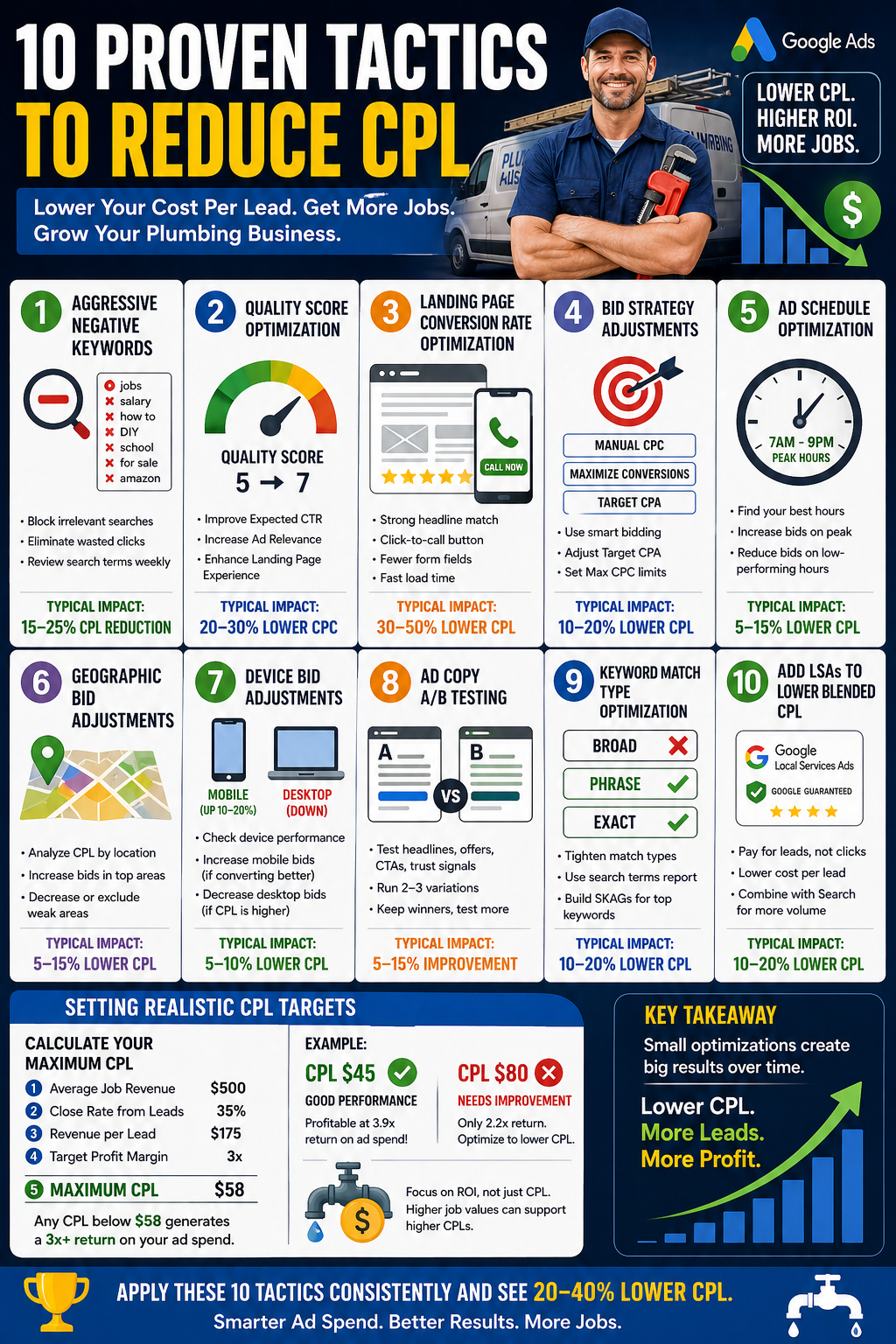 This guide covers 10 tactics that have been tested across hundreds of plumbing Google Ads accounts. Some deliver quick wins within days. Others take a few weeks to show impact. Applied together, they can reduce your cost per lead by 20-40%.