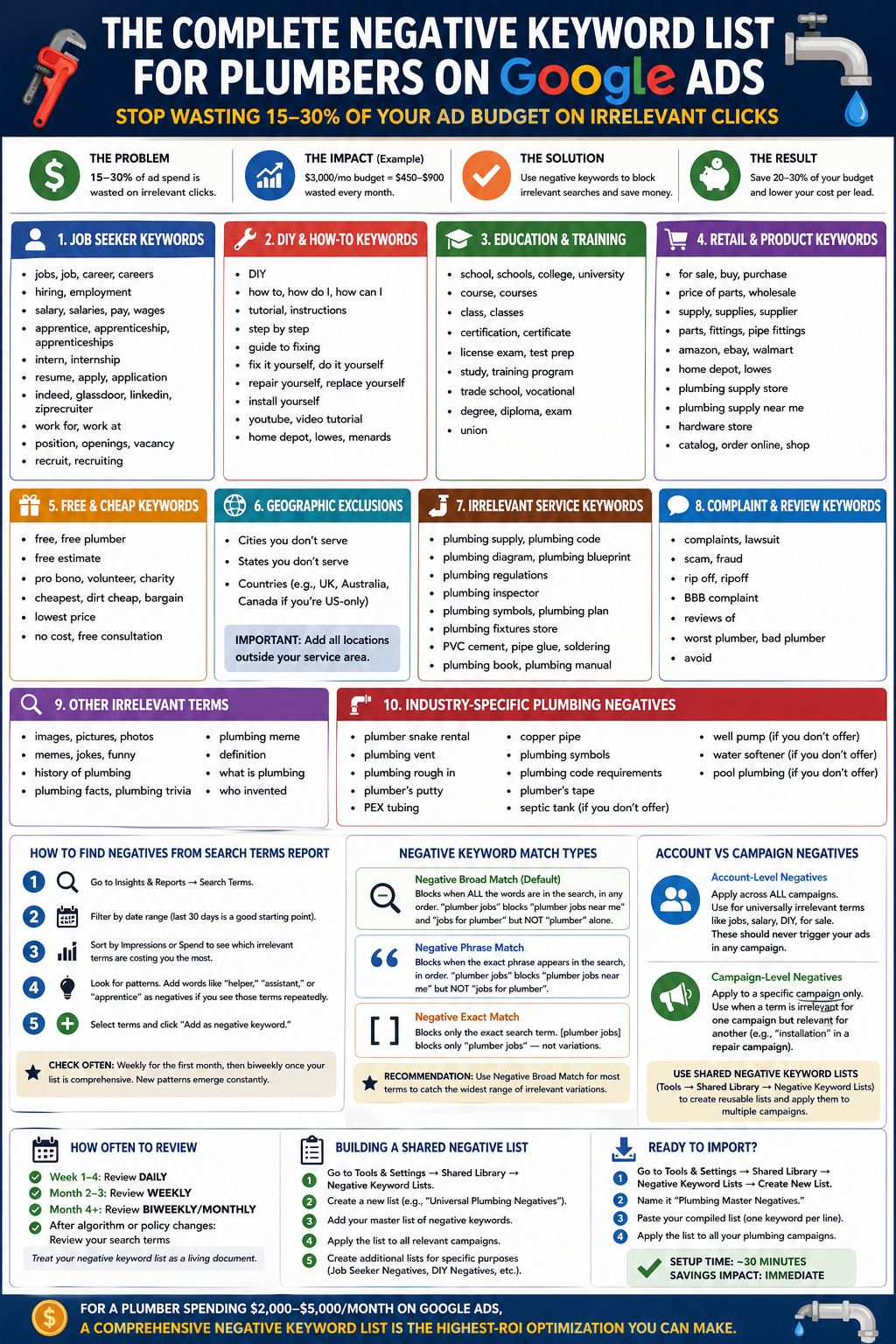 The entire setup takes about 30 minutes, and it will start saving you money immediately. For a plumber spending $2,000-$5,000/month on Google Ads, a comprehensive negative keyword list is the highest-ROI optimization you can make.